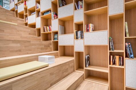 „V návrhu interiéru jsme hojně využili knihovny a také velké množství zeleně, které dohromady vytvářejí pocitově příjemný prostor i zákoutí pro nerušenou práci,“ říká architekt Jiří Bíza.
