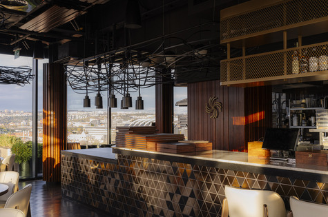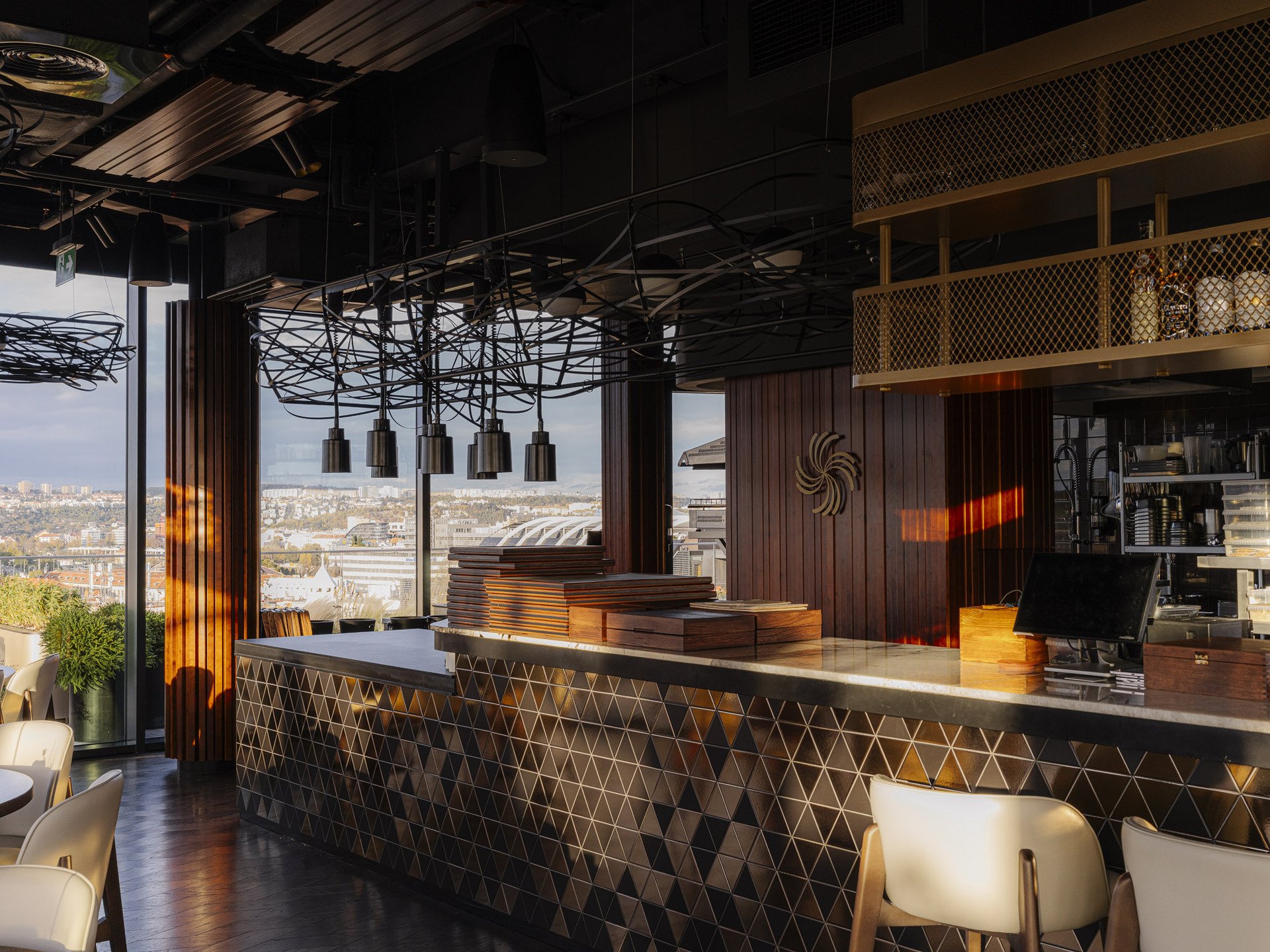 Restaurace Reason se nachází v nejvyšším patře ikonické budovy Masaryčka od ateliéru Zaha Hadid Architects, v samotném srdci Prahy. Byla navržena jako fine dining koncept, kde se v dokonalé harmonii potkává čistota materiálů, architektonická disciplína a funkční přehlednost. Barová část se rozvíjí do dvou odlišných zón: jedna je určena pro přípravu nápojů, obložená trojúhelníkovými dlaždicemi a orámovaná zavěšeným kovovým regálem na víno, druhá slouží jako výdej z kuchyně, je provedena v mramoru a doplněna organickou kovovou strukturou, která se vznáší nad prostorem. Zrcadlový „klobouk“ lemovaný stejnou trojúhelníkovou geometrií, jakou má fasáda budovy, posiluje pocit vizuální kontinuity a rovnováhy.